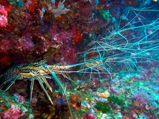 The Dive Centre is always looking for new dive sites to show our diving guests, especially since we get many guests here who come several times to visit us at Pom Pom Island Resort. Yesterday, Mario and Philippe found a new wall with many sea fans, and soft corals starting at about 10 metres and dropping to 30 metres, with lots of niches and holes in the wall for shrimps plus the colourful Painted Spiney Lobster to hide. In one hole there were at least 8 lined up waving their white feelers in the current searching for food.