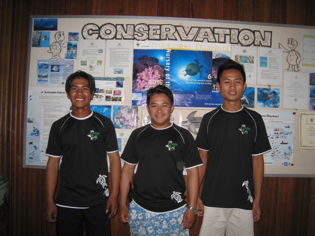 Our turtle patrol looked very smart tonight when they modelled our latest turtle patrol tee shirts. We have had them made specially, and they are for sale in our souvenir shop, with all profits from the sales going back into our Conservation Fund. The boys made the patrol last night with our lovely guests from England, no turtles but lots of sightings of beach crabs, and fruit bats. 今夜のタートルパトロール隊、新しいユニフォームを着用してスマートな装い。。 このTシャツはおみやげショップで販売中。購入代金の一部は海亀保護基金に振替されます。このパトロールボーイズ、昨日はイギリスからのラブリーゲストを率いてビーチを巡回。海亀は見つけられなかったけど、島に生息するフルーツバッドや砂浜を足早に駆け抜けるカニなんかが見れて楽しかったわ!