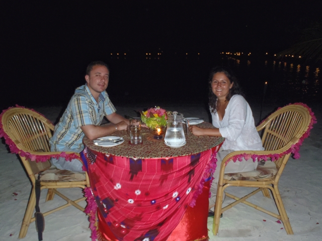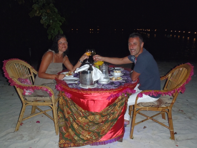 To celebrate their honeymoons, some of our guests decided to opt for our special dining service. For a small charge, we arrange for them to enjoy their dinner with personal service under stars. With tables beautifully dressed and displayed with flowers, the food is lit with candle light and soft firelight. They are set on the beach so you can enjoy the moonlight on the sea and feel the fresh tropical breeze. Our staff prepare and serve local and international dishes and we also made celebration cakes for the celebrations.