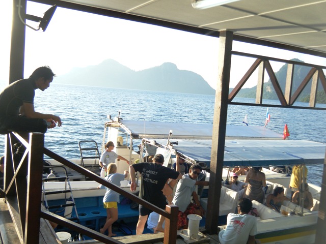 Yesterday morning, we planned to go to Mantabuan and Bohey Dulang Island for snorkelling and diving activities, but because of the weather, we postponed to afternoon trip. We depart from Pom Pom Island at 2.30pm using 2 diving boats and heading to Mantabuan Island. 1 boat assist the divers and 1 boat assist the Snorkelling group. We go snorkelling at Mantabuan area and saw turtle, fishes and varieties of corals. Plus, the water visibility is very good. After an hour snorkelling, we having tea break onboard while heading to Bohey Dulang Island.