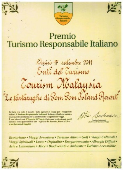 Last 17th September 2011, Pom Pom Island Resort won award from Tourism Malaysia in Italy because of the Turtle Conservation Program that we running here. We have a turtle hatchery to translocate the turtle eggs from other threats. Plus, by having the turtle hatchery, guests have the chances to see the baby turtle born.