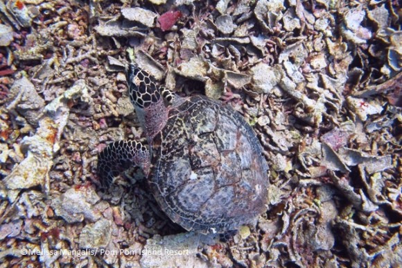 Herewith I share some pictures of the Hawksbill turtle this morning we spotted just in front of our jetty. She’s a female Hawksbill turtle, hopefully soon she will laid some more eggs on Pom Pom beach!