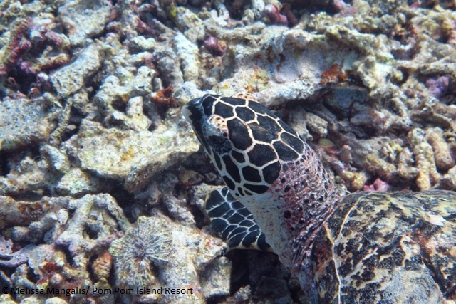 Herewith I share some pictures of the Hawksbill turtle this morning we spotted just in front of our jetty. She’s a female Hawksbill turtle, hopefully soon she will laid some more eggs on Pom Pom beach!