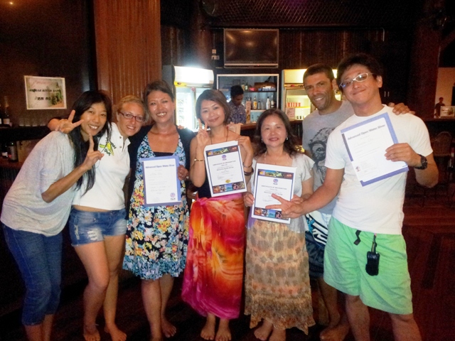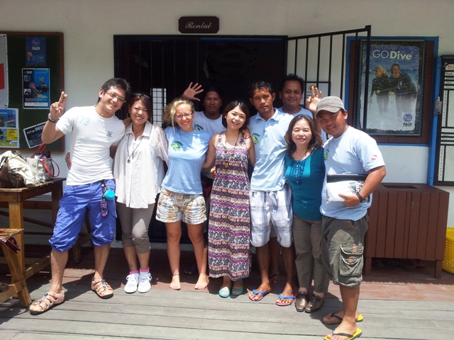 Mrs.Mika & Mr.Daisuke upgraded to Advanced Open Water Diver trained by Eleonora, also Mom Teruyo & Miss.Naho experienced their first diving with Rayner. Look the picture, Mika and all of them were very happy given the ceritifications by Eleonora !!! 今週は とってもフレンドリーな日本のお客様”太田ファミリー”がポンポン島にご滞在。ミカさんと大介さんはダイビングインストラクターのエレオノラから指導を受けてアドバンスコースを取得。ママ・晃代さんと奈穂さんは初めてのダイビングをライネルと一緒に楽しんだのよ。ほら写真を見て!ミカさんとみんな、エレから修了書をもらってとってもうれしそう!!!