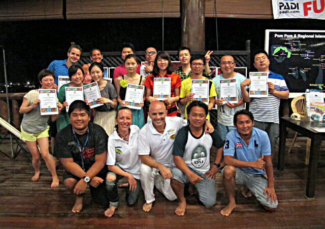 体験ダイビングがリゾートゲストに大人気!昨晩のローカルダンスショーのあとはインストラクターのマイソン君のアナウンスにより修了書が授与されました。初めてのダイビングをポンポン島で体験した12名のゲスト、修了書を受け取りみんなうれしそう!