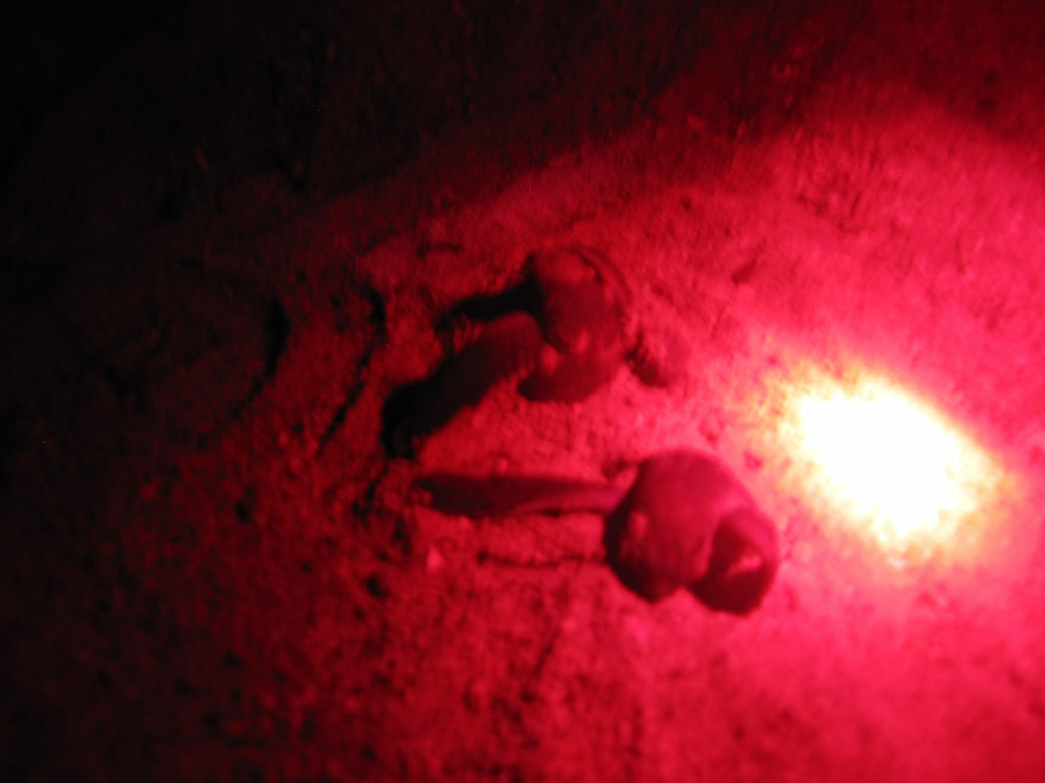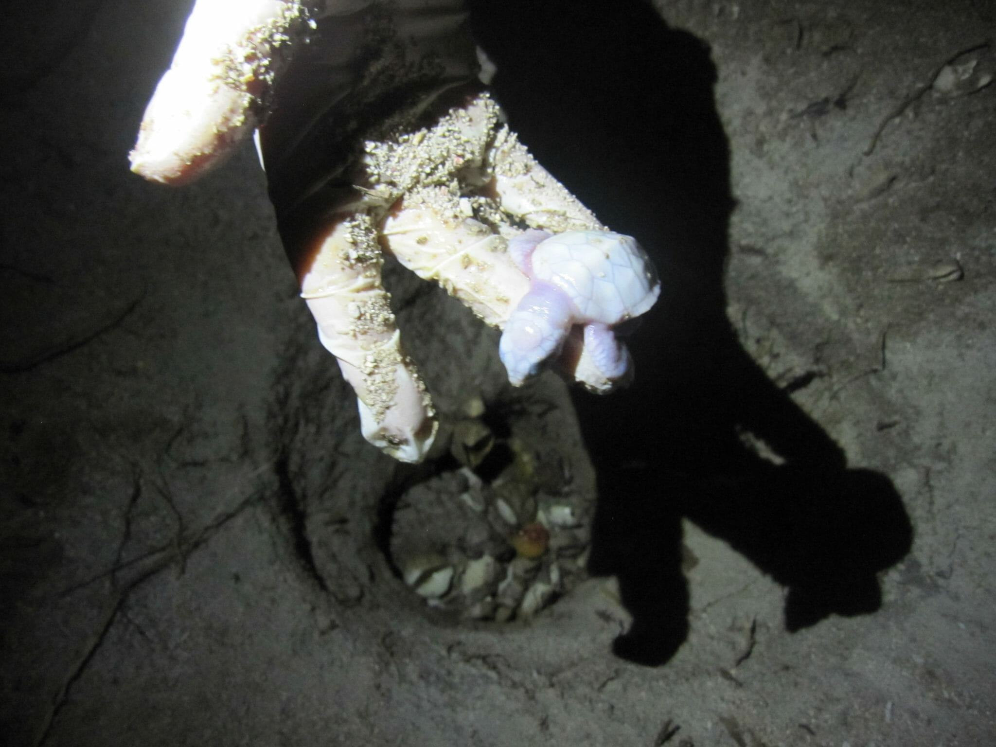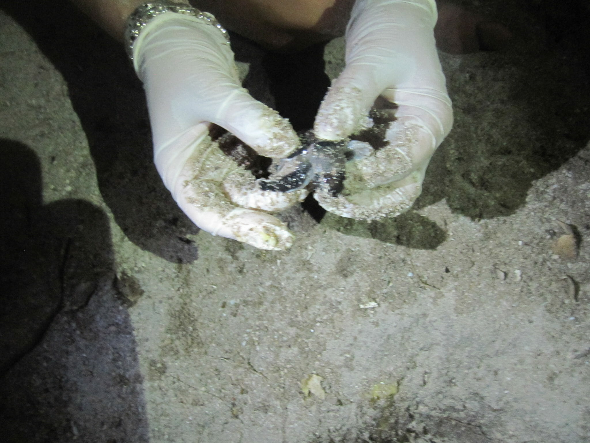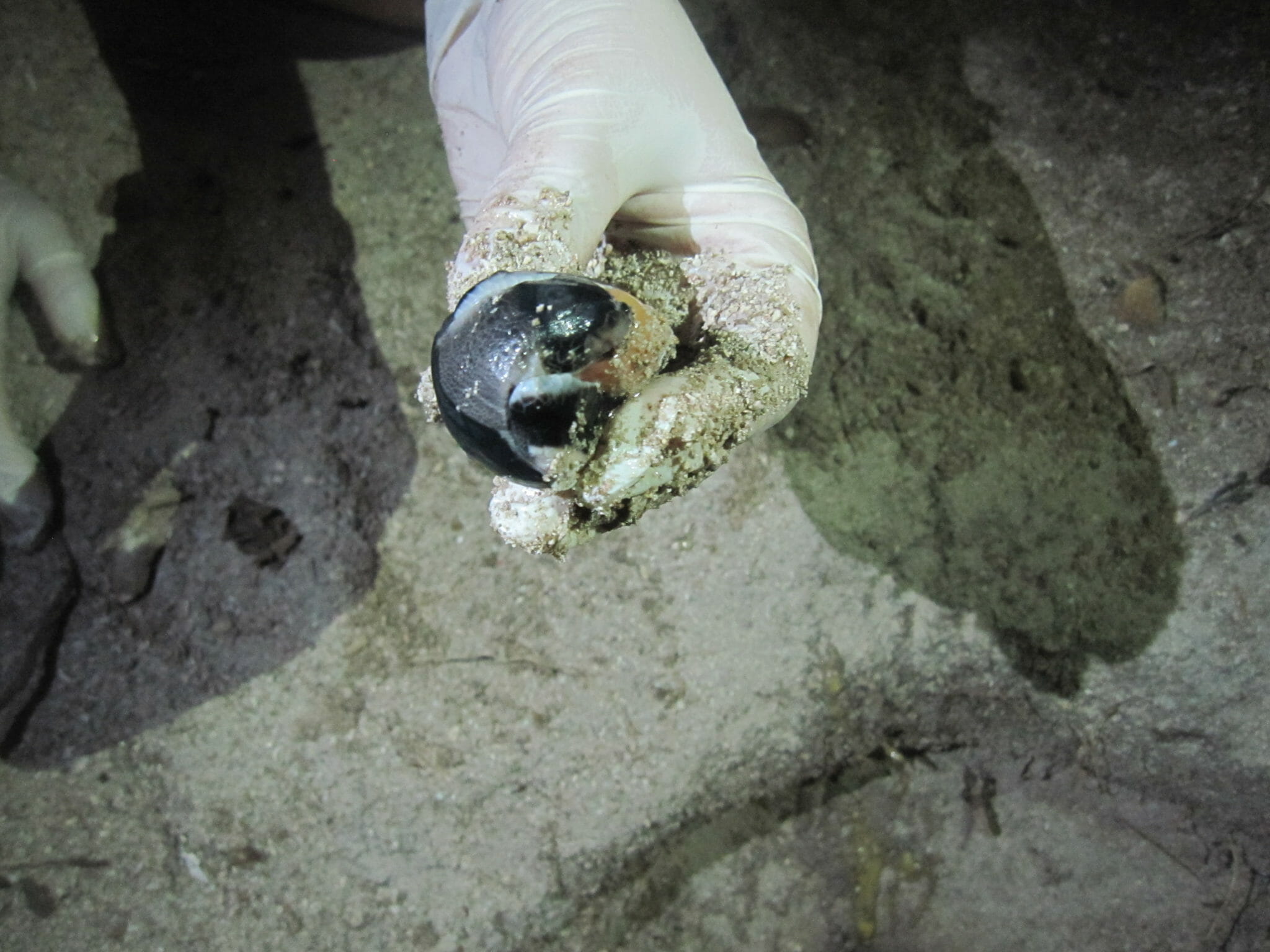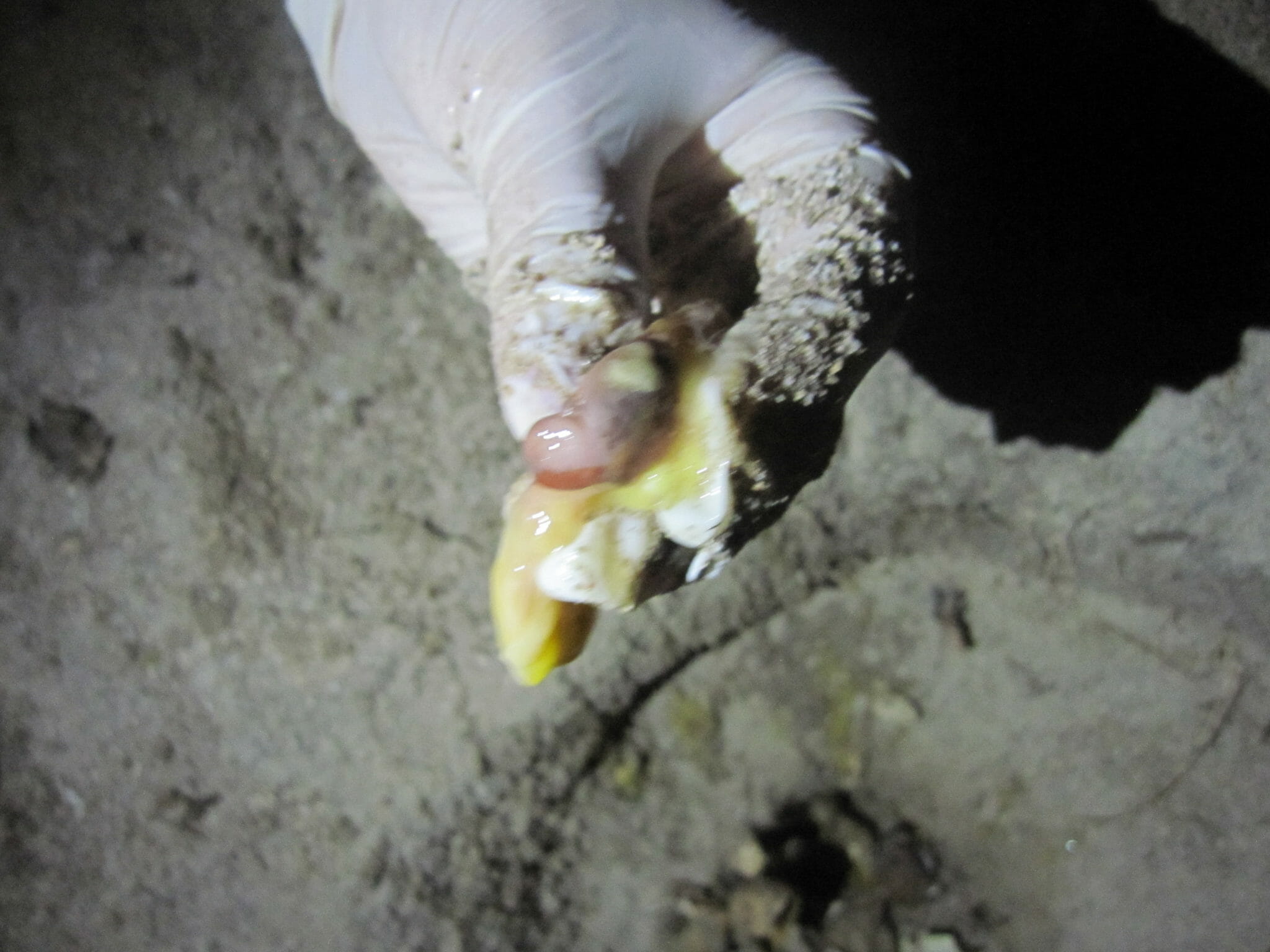 After the green turtle hatchlings were found the nest was caged and monitored for any other hatchlings emerging. Hatchlings were found in three more occasions, they were collected and released many guests joined for the releases. Two days after the hatchlings were found the nest exhumation was done. Guests were invited to see this and the procedure was explained. From the exhumation it was calculated that 130 eggs had been laid and the nest had a 86% hatching success rate which is considered very high. From the unhatched eggs there was one albino hatchling, a stage one embryo and a few stage 3 and 4, you can see in the pictures.