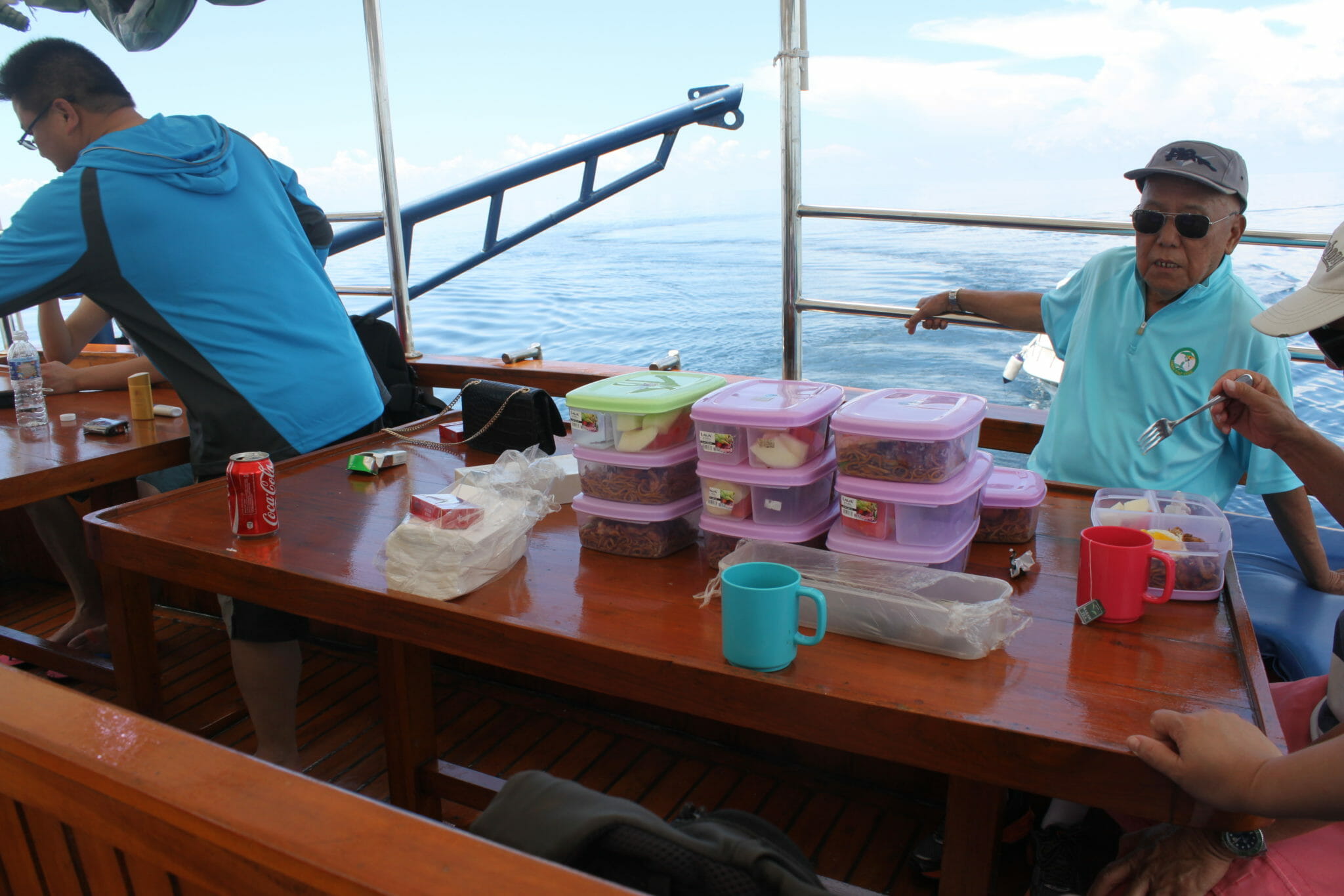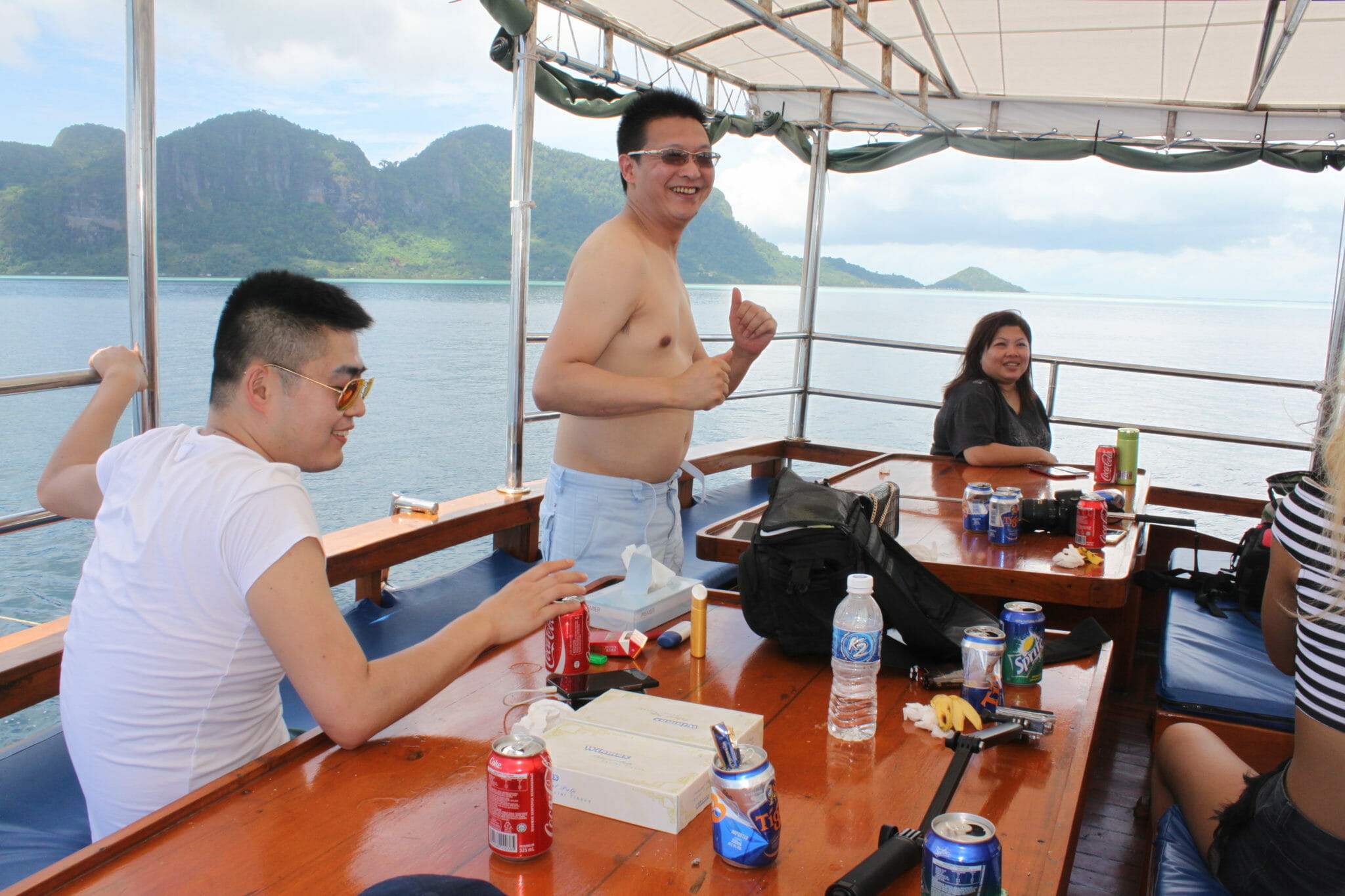 与8位来自中国的客人在这阳光明媚的天气一起乘搭公主号。我们早上9.30启航,前往马来西亚军舰岛(也被称为西布安岛),经过波黑杜朗岛和曼达布安岛。沿着海,漂亮的景色让客人们都停不下手不停的拍照留念以及观光游船,享受他们在一起的时光。当我们到达军舰岛,我们在那逗留了大约30分钟,让大家享受午餐。过后大家就收拾心情回邦邦岛。